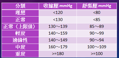 依據世界衛生組織所定標準,連續兩次血壓值皆顯示收縮壓高於 140mmHg 以上、舒張壓高於90mmHg 以上,即是高血壓。收縮壓在140mmHg,舒張壓在 90mmHg 以下,為正常血壓。