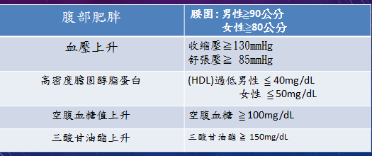 衛生署.代謝症候群最新判定標準下述5項危險因子,若包含三項或三項以上就算是代謝症候群。