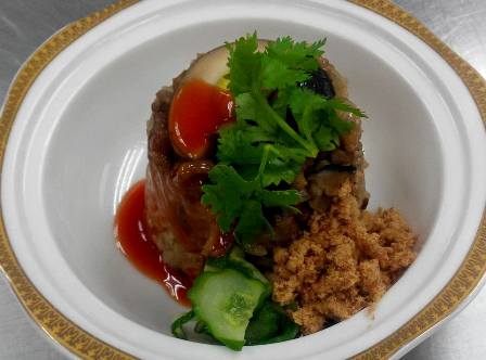 4.盅內底部放入滷蛋、香菇片,再依序填入炒料、糯米。