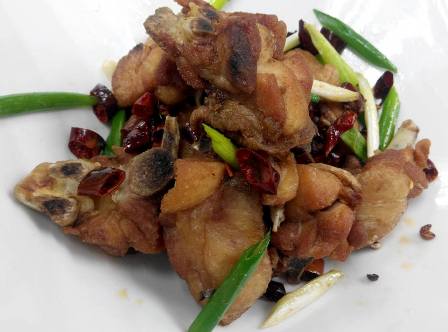 4.起少許花椒油炒鍋,炒香乾辣椒與少許花椒粒 倒入雞塊拌.加鹽或胡椒粉少許調味.續下蔥段拌.起鍋盛盤。