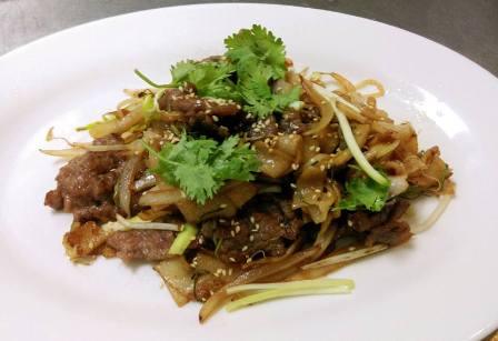 3.少油大火爆香洋蔥絲、蔥絲、薑絲、豆芽菜.待香氣呈現時下粄條大火拌炒,續下調味(醬油2T),起鍋前下牛肉及韭黃,盛盤後綴以芝麻、香菜即可。