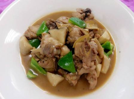 4.麻油煸香薑片,放入雞塊拌炒後加入蠔油.杏鮑菇及水少許.上蓋燜煮5分鐘後大火略收汁.起鍋前放入青椒略拌炒.淋上花雕酒後立即熄火盛盤*
