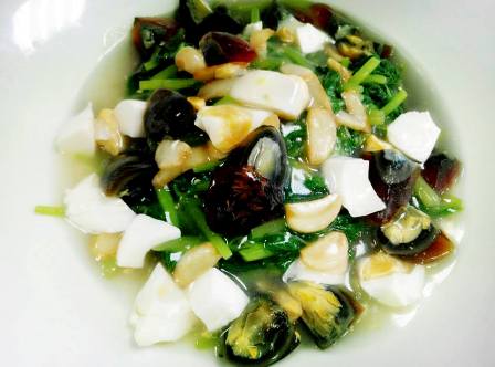 食材:莧菜1斤、皮蛋2粒、鹹鴨蛋1粒、蒜頭片