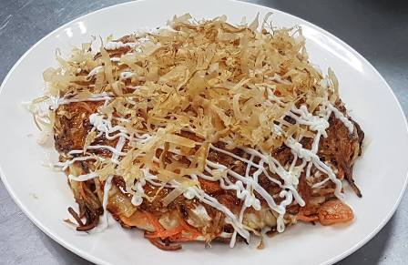 材料:高麗菜3兩、洋蔥1/6顆、蛋1顆、紅蘿蔔1/4、細柴魚10g、沙拉醬半條、照燒醬30g、蝦仁2兩、油麵100g、中筋麵粉2/3杯、太白粉1/3杯、