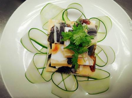 1.皮蛋及鹹鴨蛋以熱水煮10分鐘,去殼切小塊。
