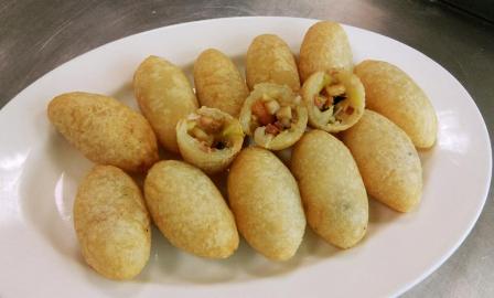 下水少許略燒下芡汁收乾(芡汁:麵粉加太白粉1:1), 內餡需呈乾爽無汁狀態,待涼後再與韭黃丁拌
