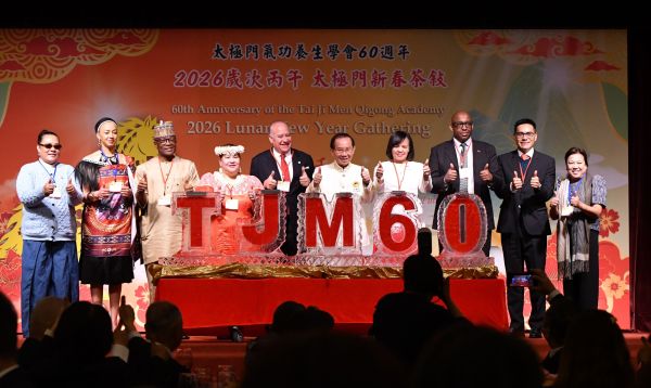 P1. 2026年太極門新春茶敍,展現「和平永續 福馬奔騰」精神,獲得約50國熱烈響應,現場合照,祈祝新年快樂。